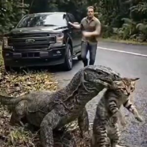 A startling encounter unfolded on a remote jungle road when a massive lizard emerged from the undergrowth and seized a domestic cat, leaving a passing driver in…