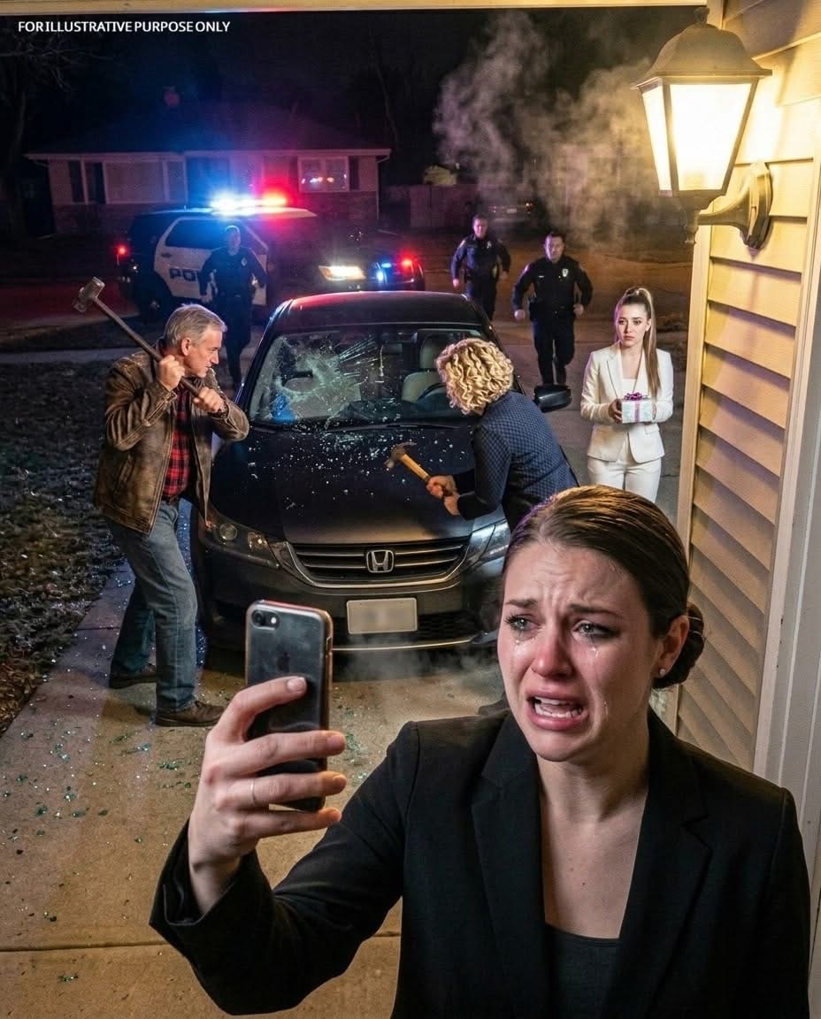 What they didn’t know was that the car wasn’t mine. I had parked my real vehicle safely elsewhere and borrowed a training sedan from a friend who worked for a security company—one equipped with cameras and properly registered under his employer. As they kept smashing it, I recorded everything and called my friend. Within minutes, police lights filled the driveway. My parents tried to claim they were simply disciplining their daughter, but the footage, the registration paperwork, and the damage told a very different story. Suddenly their “lesson” had turned into a criminal vandalism case.