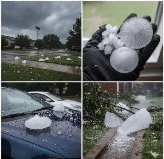 On Tuesday evening, a powerful thunderstorm swept across a quiet rural community, bringing with it an unexpected and dangerous surprise. Dark clouds quickly filled the sky, and within minutes large chunks of ice began falling from above. Residents watched in disbelief as hailstones—some nearly the size of softballs—struck rooftops, vehicles, and fields with incredible force.