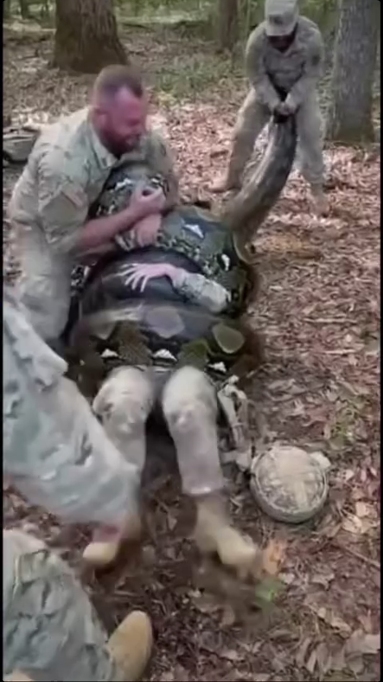 In the footage, the soldier struggles to stay in control and survive, while another soldier steps in to help, trying to pull the snake away from behind. The situation appears extremely dangerous, as snakes of this size can suffocate their prey within minutes.