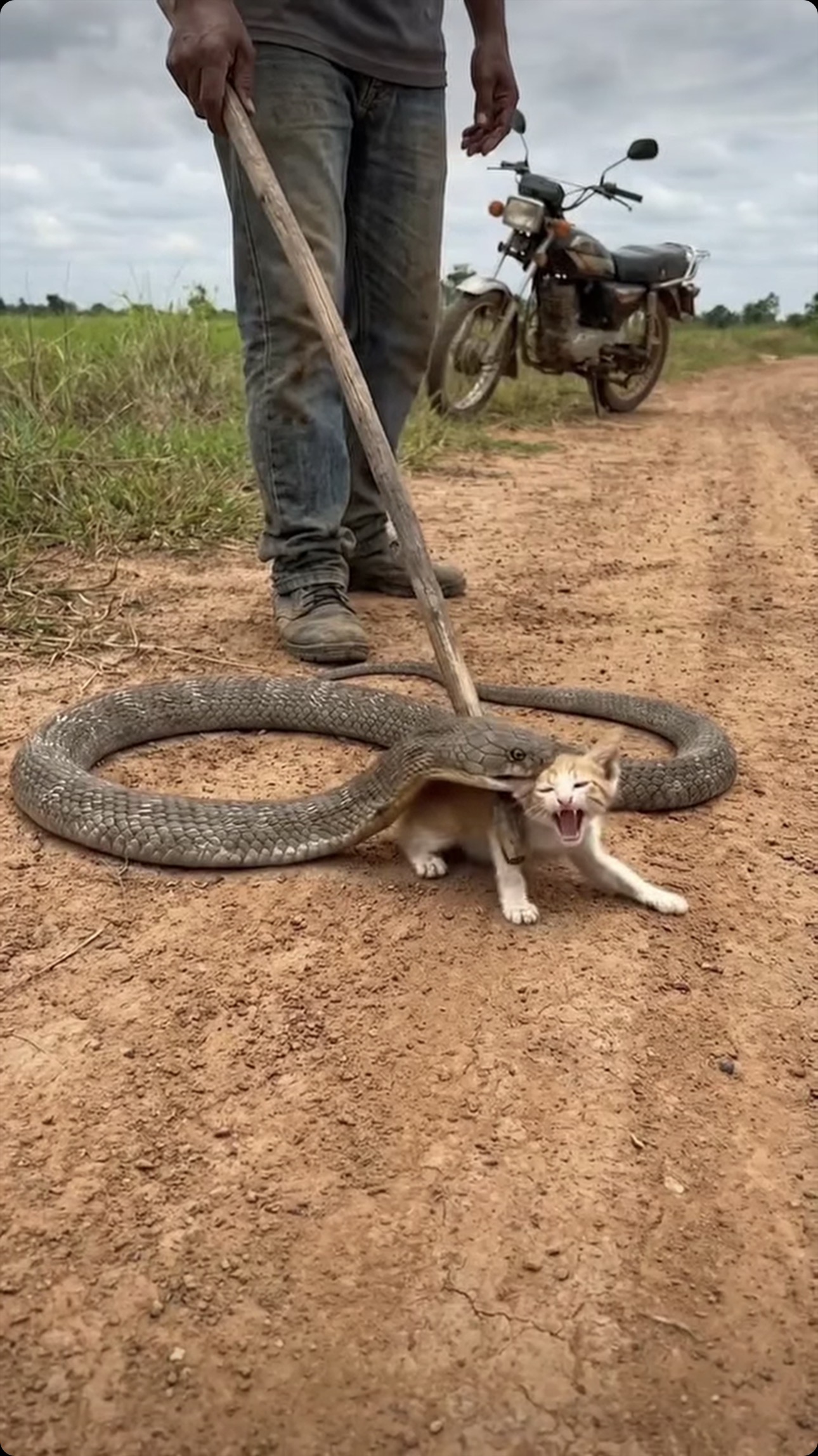 In a surreal moment on a rural dirt road, a king cobra has a tiny orange kitten completely engulfed in its jaws —