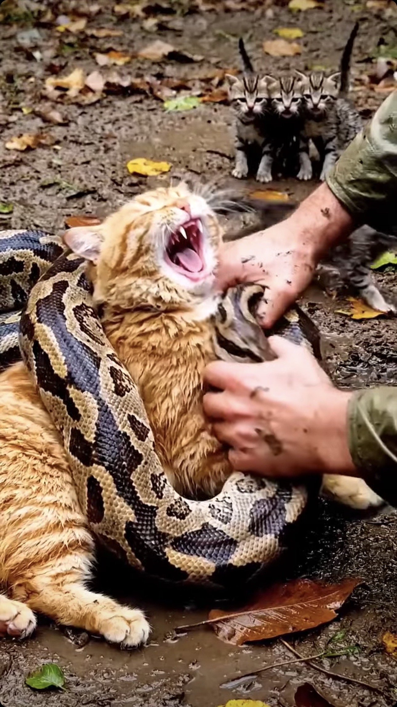 The snake thrashed, striking wildly, but the rescuer refused to let go. Every pull felt like a battle against time itself. At last, the coils loosened and the cat tumbled free, gasping, trembling, alive. The snake vanished into the brush, defeated but not destroyed. In the shaken quiet that followed, one truth lingered: danger will always exist, but so will people willing to stand between death and the defenseless, even when no one is watching.