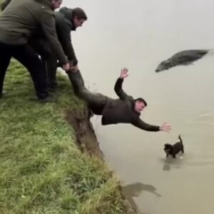 In a dramatic moment captured near a quiet riverside, a group of men worked together to rescue a small dog that had wandered into deep water. The…